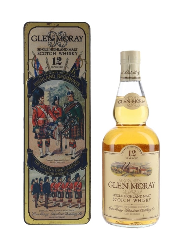 A bottle of Glen Moray 12 Year Old Single Highland Malt Scotch Whisky in a Scotland's Historic Highland Regiments tin. This tin depicts The Queen's own Cameron Highlanders. We estimate this was bottled in the 1980s.