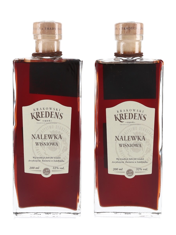 This lot contains two 20cl bottles of Krakowski Kredens Nalewka Wisniowa, a cherry liqueur produced in Poland following Galician distillation traditions.