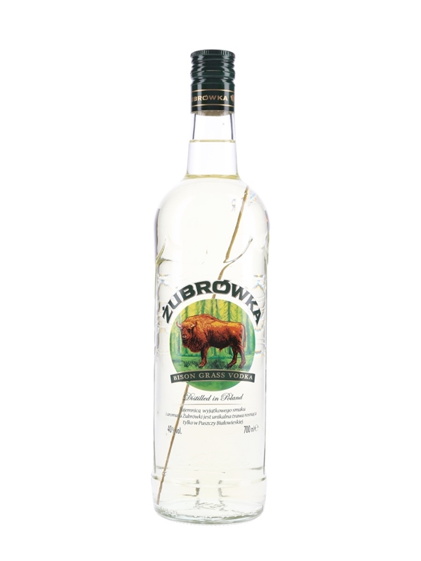 A bottle of Żubrówka Bison Grass Vodka from Poland.