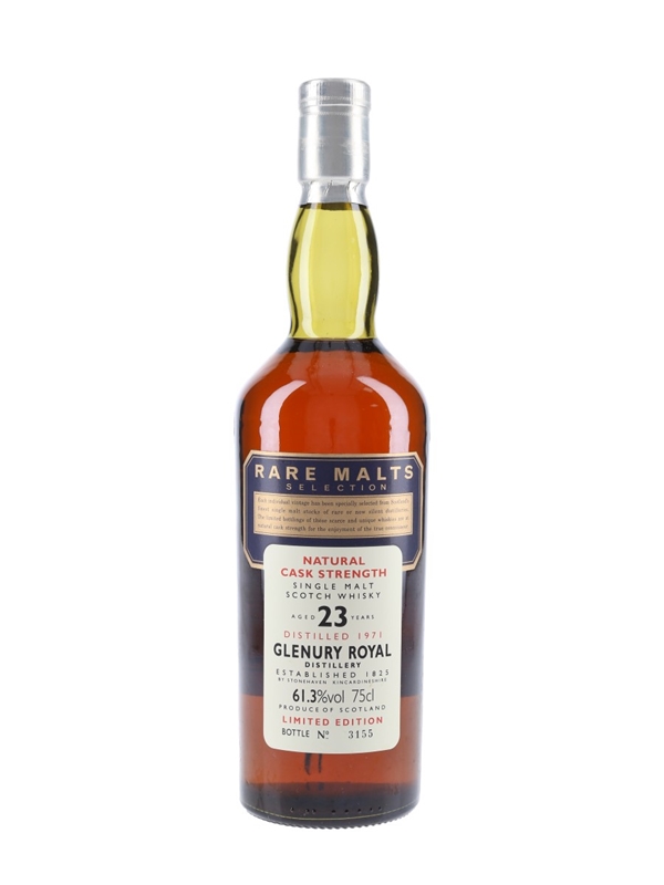 A bottle of Glenury Royal 23 Year Old Single Malt Scotch Whisky. This was distilled in 1971 and bottled for Diageo's now-discontinued Rare Malts Selection.