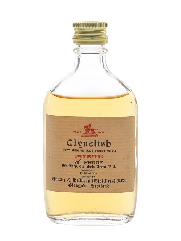 A miniature bottle of Clynelish 12 Year Old Finest Highland Malt Scotch Whisky, bottled by the distillers Ainslie & Heilbron Ltd.