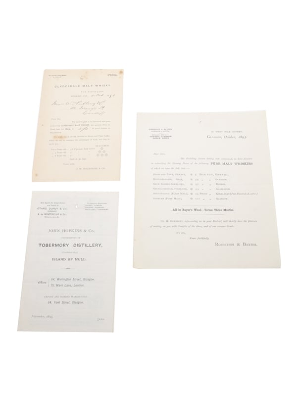 Assorted Price Lists, Dated 1893 Clydesdale Malt Whisky, John Hopkins & Co., Robertson & Baxter