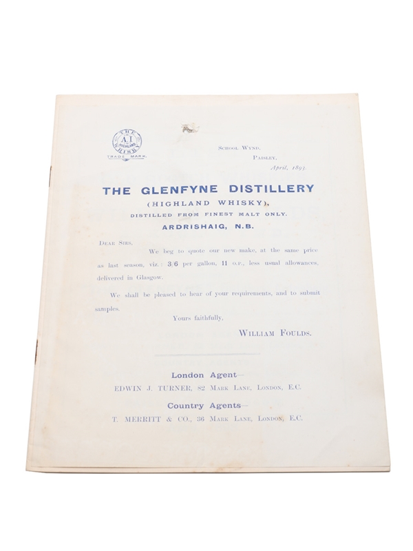 William Foulds List Of Old Scotch Whiskies, dated April 1893. This is a 20 page wholesale list of casks of whisky brokered by William Foulds, proprietor of Glenfyne distillery.
