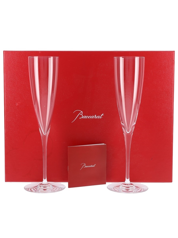 A set of two Baccarat Crystal Champagne flutes in a red presentation box.