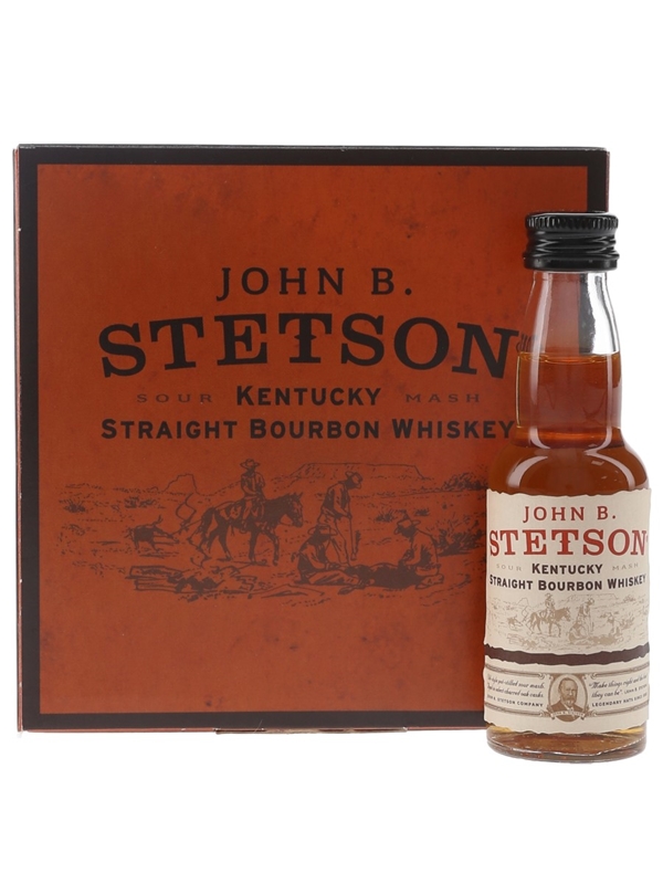A miniature bottle of John B. Stetson Kentucky Straight Bourbon Whiskey in a presentation box.