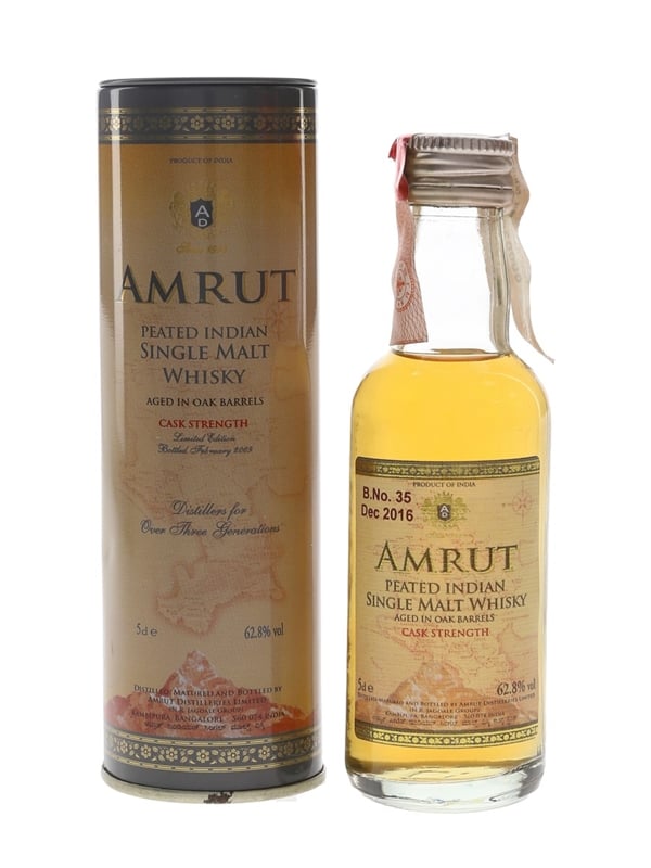 A Limited Edition bottle of Amrut Peated Single Malt Whisky from India. This was matured in oak barrels and bottled at cask strength in December 2016.