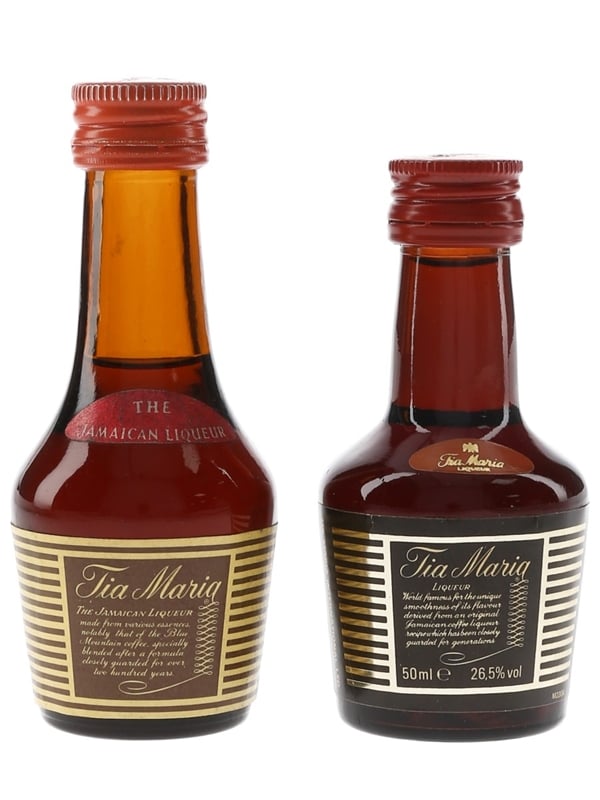 This lot contains two miniature bottles of Tia Maria, a Jamaican coffee liqueur. We estimate these were bottled in the 1970s and 1990s.