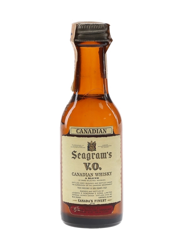 A miniature bottle of Seagram's VO Canadian Whisky. The Canadian tax strip reads 1969. This indicates that the youngest whisky in the bottle was distilled in 1969.