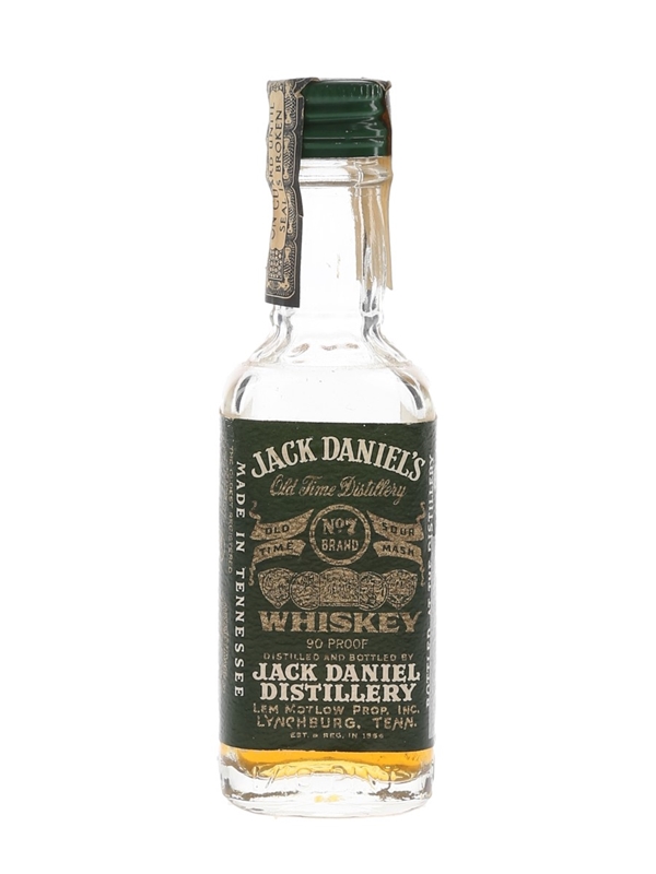 A miniature bottle of Jack Daniel's No.7 Brand Green Label Old Time Sour Mash Tennessee whiskey distilled and bottled by Jack Daniel Distillery Lem Motlow, Prop. Inc. This was bottled for the Italian market and imported by Soffiantino, we estimate in the 1970s.