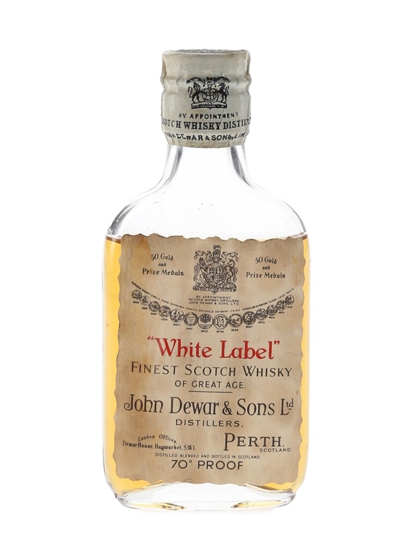 A bottle of Dewar's White Label blended Scotch whisky, sealed with a spring cap closure. We estimate this was bottled in the 1940s to 1950s.
