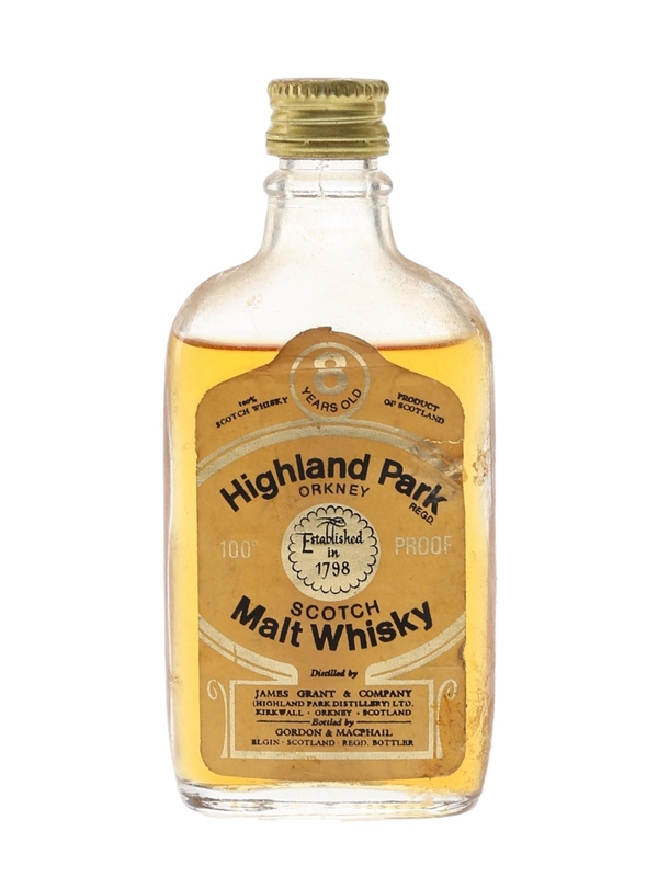 A miniature bottle of Highland Park 8 Year Old 100 Proof Orkney Malt Scotch Whisky produced by James Grant & Company. This was bottled by Gordon & MacPhail, we estimate in the 1970s.