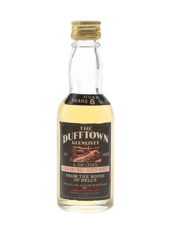 A miniature bottle of The Dufftown Glenlivet 8 Year Old Highland Malt Scotch Whisky, distilled and bottled by Arthur Bell & Sons. We estimate this was bottled in the 1970s, when it was common to use the 'Glenlivet' suffix for Speyside distilleries.
