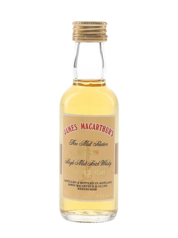 A miniature bottle of Speyburn 12 Year Old Single Malt Scotch whisky, bottled for James MacArthur's Fine Malt Selection. This was bottled in September 1992 for The Mini Bottle Club, UK.