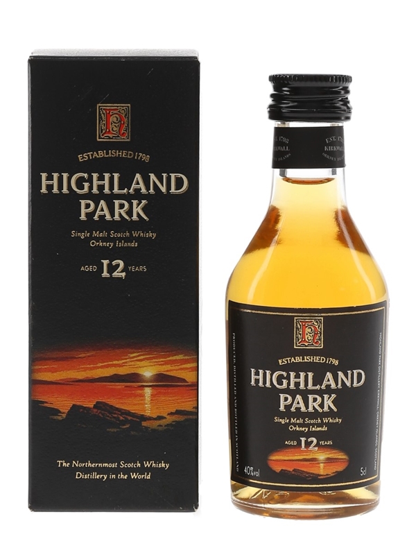 A miniature bottle of Highland Park 12 Year Old Single Malt Scotch Whisky from the Orkney Islands. We estimate this was bottled in the 1990s.
