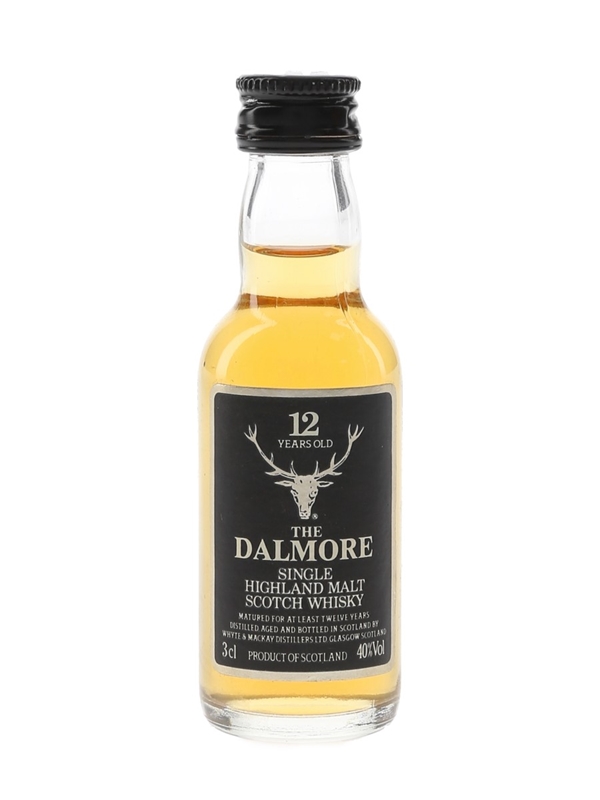A miniature bottle of The Dalmore 12 Year Old Single Highland Malt Scotch Whisky, produced in Scotland by Whyte & Mackay Distillers Ltd. We estimate this was bottled in the 1980s.