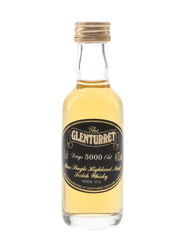 A miniature bottle of The Glenturret 5000 Days Old Pure Single Highland Malt Scotch Whisky.