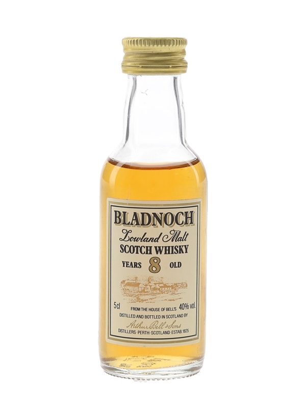 A miniature bottle of Bladnoch 8 Year Old Lowland Malt Scotch Whisky, produced in Scotland by Arthur Bell & Sons. We estimate this was bottled in the 1980s.