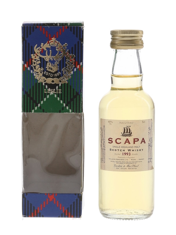 A miniature bottle of Scapa 1993 single malt Scotch whisky bottled by Gordon & MacPhail. The bottle code indicates this was bottled in 2006.
