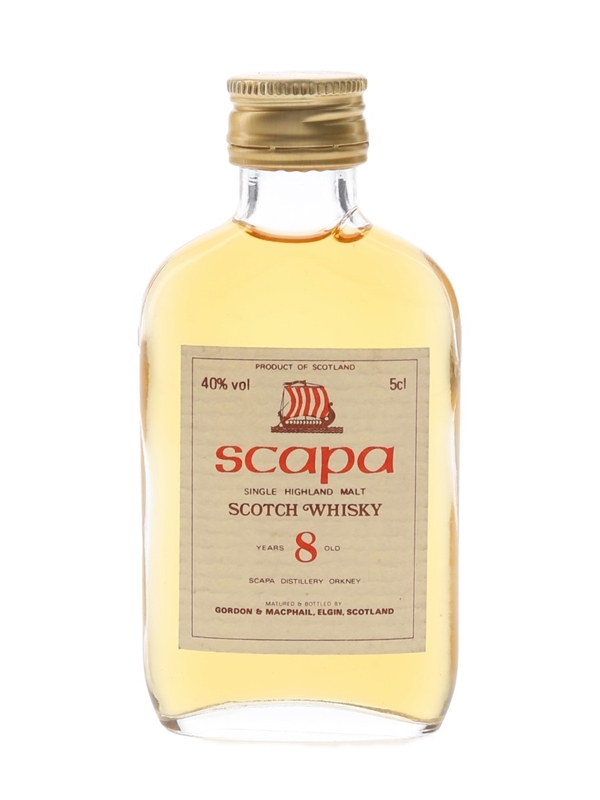 A miniature bottle of Scapa 8 Year Old Single Malt Scotch Whisky, bottled by Gordon & MacPhail. We estimate this was bottled in the 1980s.