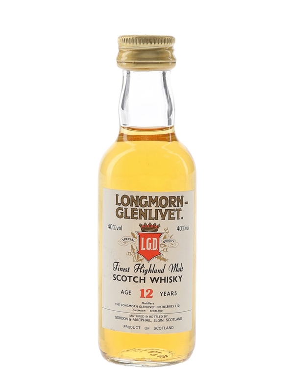 A miniature bottle of Longmorn-Glenlivet 12 Year Old Pure Malt Scotch Whisky, bottled by Gordon & MacPhail. We estimate this was bottled in the 1980s.
