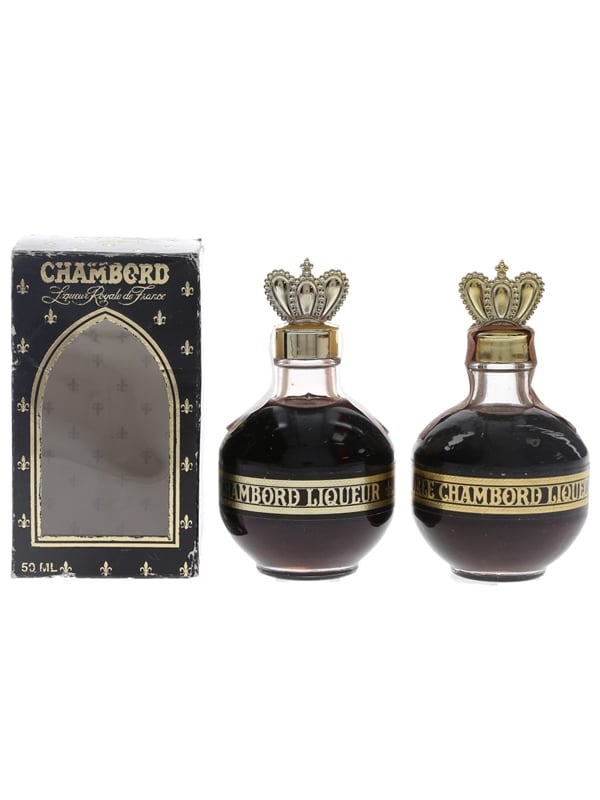 This lot contains two miniature bottles of Royale Chambord liqueur from France, one boxed and one unboxed.