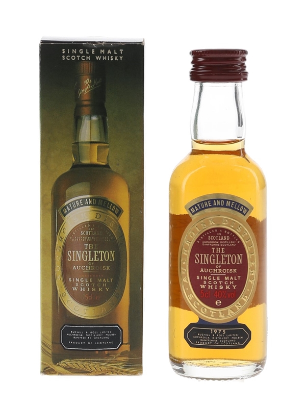 A miniature bottle of The Singleton of Auchroisk 1975 Single Malt Scotch Whisky.