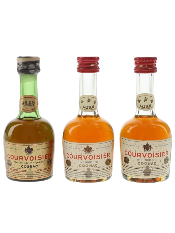 This lot contains three miniature bottles of Courvoisier 3 Star Luxe Cognac. We estimate these were bottled in the 1970s and 1980s: