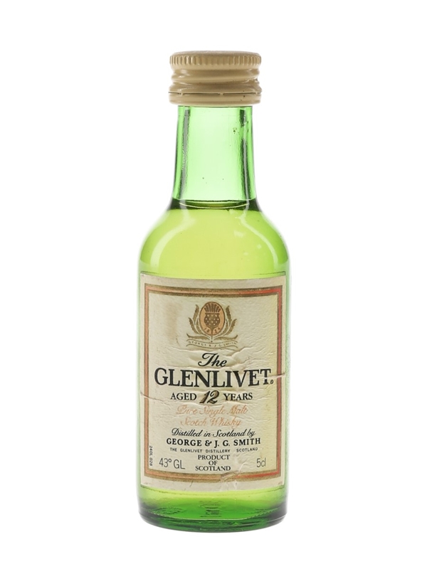 A miniature bottle of The Glenlivet 12 Year Old Pure Single Malt Scotch Whisky, distilled in Scotland by George & J G Smith. We estimate this was bottled in the 1980s.