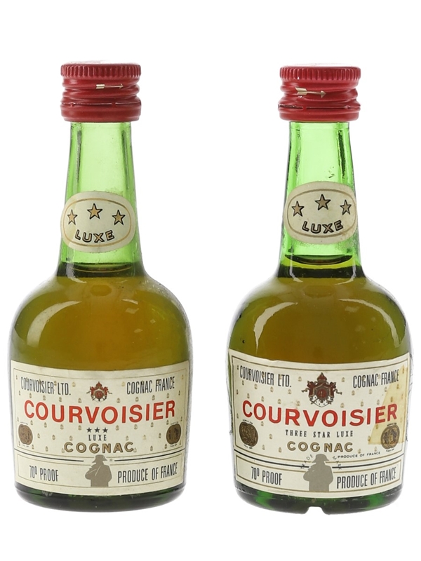 This lot contains two miniature bottles of Courvoisier 3 Star Luxe Cognac. We estimate these were bottled in the 1970s.