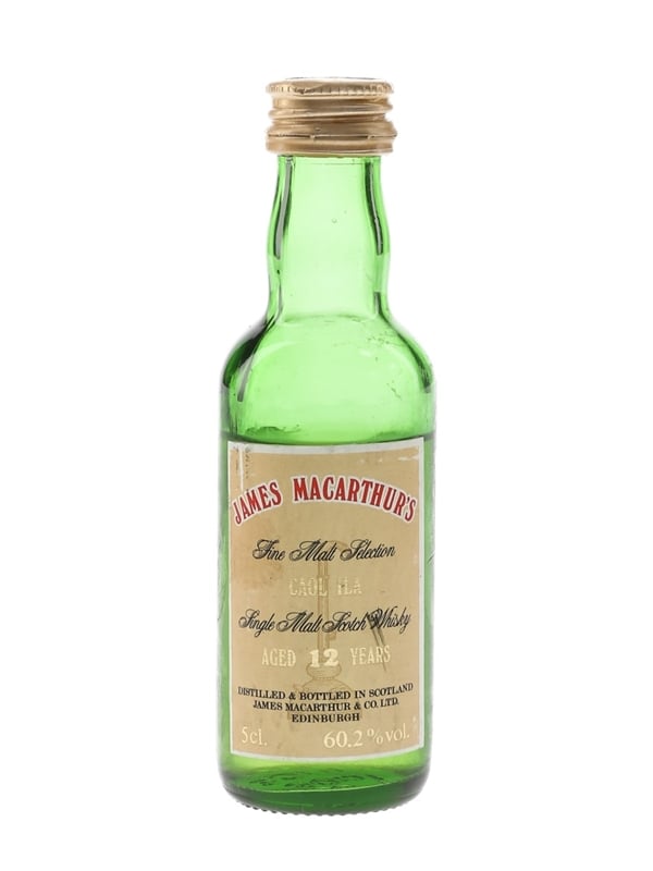 A miniature bottle of Caol Ila 12 Year Old Fine Malt Selection Single Malt Scotch Whisky, bottled at 60.2% ABV by James MacArthur.