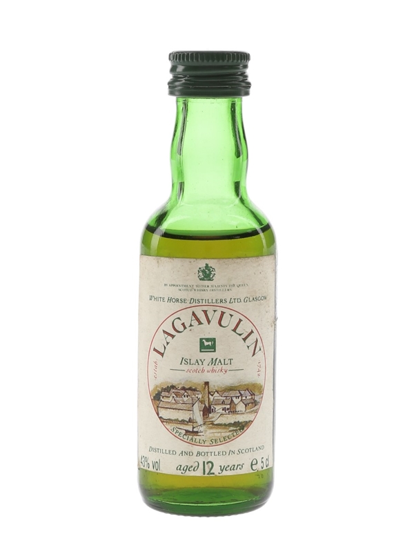 A miniature bottle of Lagavulin 12 Year Old Islay Malt Scotch Whisky, produced by White Horse Distillers Ltd. We estimate this was bottled in the 1980s.