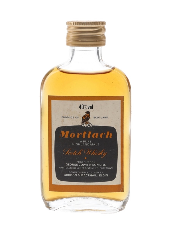A miniature bottle of Mortlach Pure Highland Malt Scotch Whisky, bonded and bottled by Gordon & MacPhail. We estimate this was bottled in the 1980s.