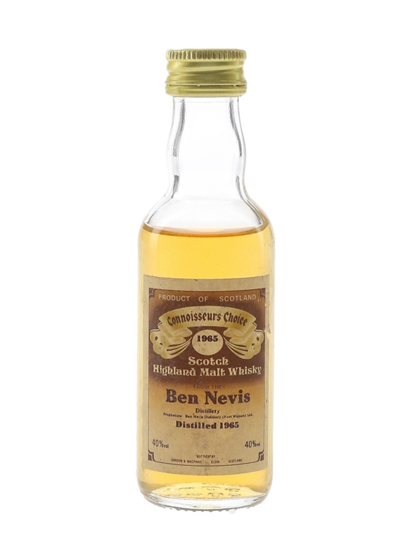 A miniature bottle of Ben Nevis Highland single malt Scotch whisky, distilled in 1965 and bottled by Gordon & MacPhail as part of the Connoisseurs Choice series. We estimate this was bottled in the 1980s.