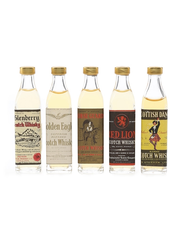 This lot contains five novelty 1.1cl miniature bottles of blended Scotch whisky. We estimate these were bottled in the 1970s.