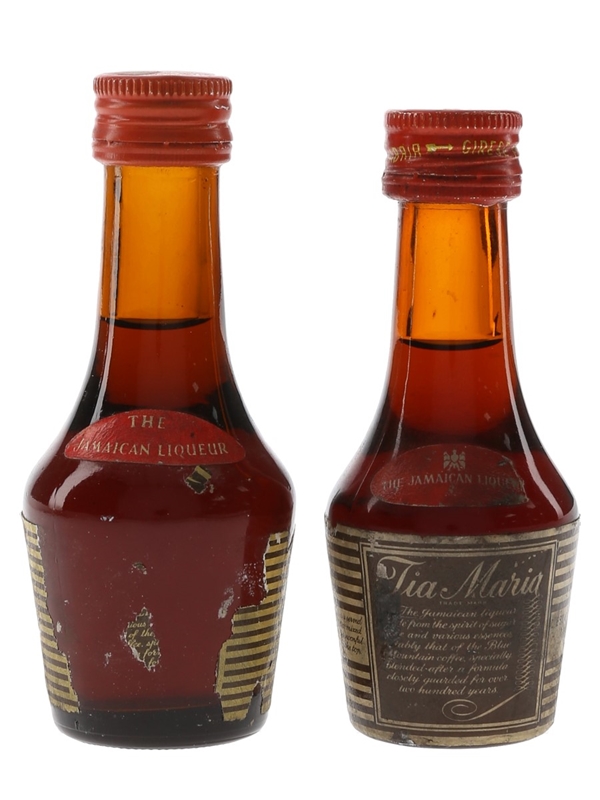This lot contains two miniature bottles of Tia Maria, a Jamaican coffee liqueur produced and bottled by Estate Industries Ltd., Jamaica, on behalf of United Rum Merchants Ltd., London. We estimate these were bottled in the 1970s.