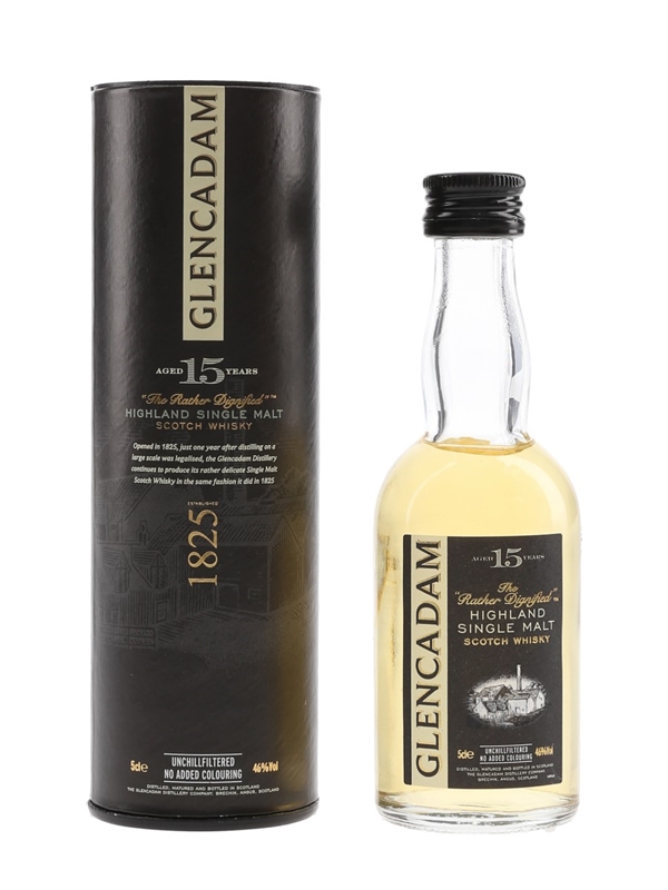 A miniature bottle of Glencadam 15 Year Old, 'The Rather Dignified' Highland Single Malt Scotch Whisky. The bottling code indicates this was bottled in 2009.
