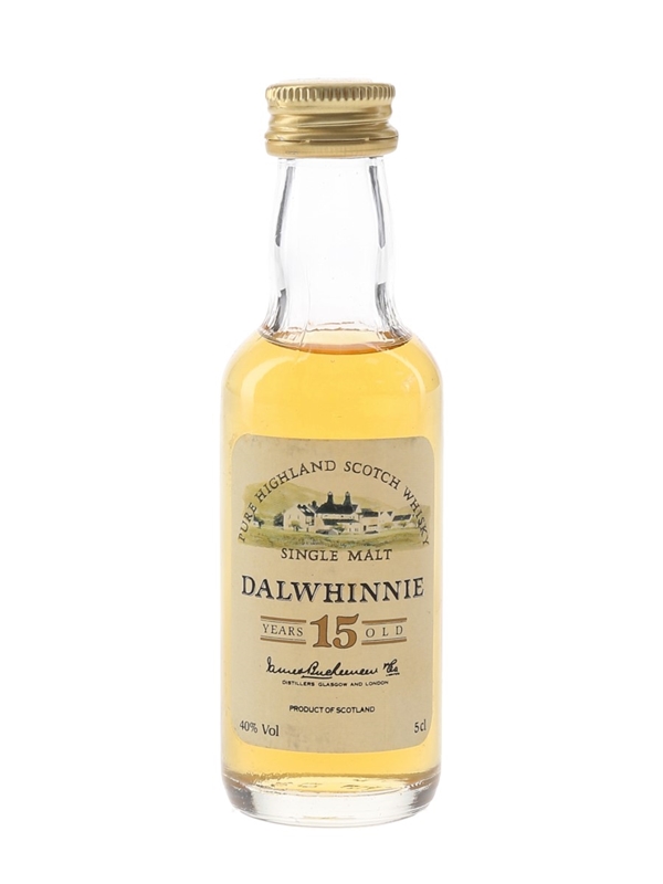 A miniature bottle of Dalwhinnie 15 Year Old Pure Highland Single Malt Scotch Whisky. This was produced and bottled by James Buchanan & Co. We estimate this was bottled in the 1980s.