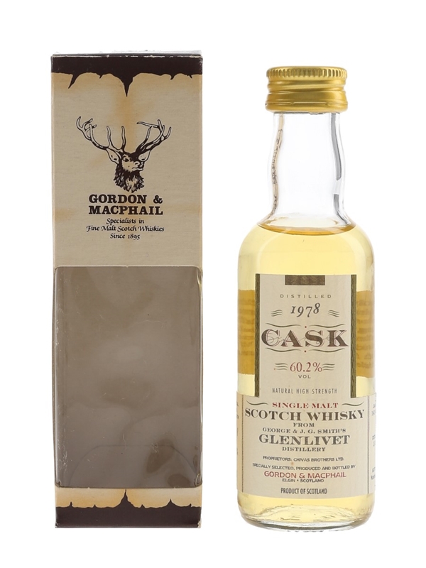 A miniature bottle of Glenlivet 1978 Single Malt Scotch Whisky. This was distilled on 13 October 1978 and bottled in November 1996 by Gordon & MacPhail as part of the Cask Strength series.