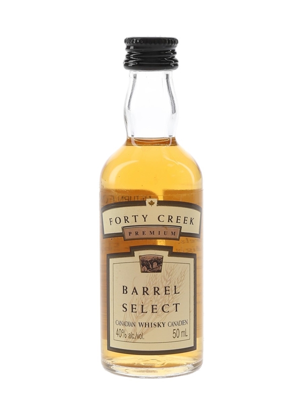 A miniature bottle of Forty Creek Premium Barrel Select Canadian whisky.