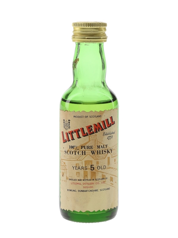 A miniature bottle of Littlemill 5 Year Old Pure Malt Scotch Whisky. We estimate this was bottled in the 1980s.