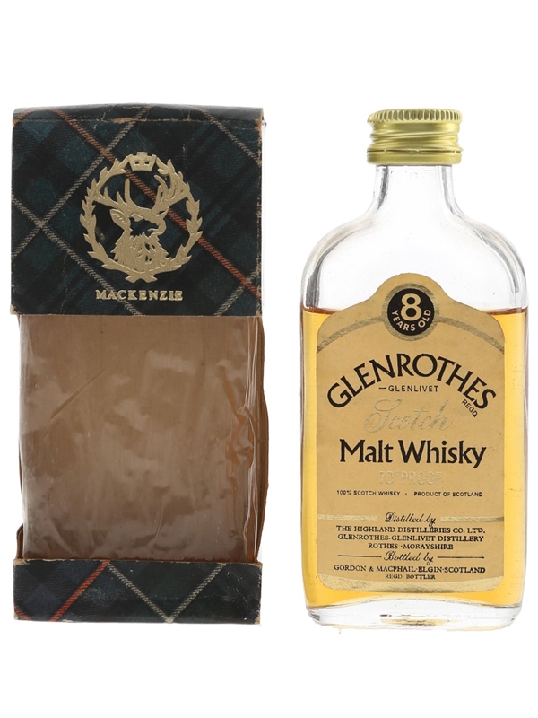 A miniature bottle of Glenrothes-Glenlivet 8 Year Old Scotch Malt Whisky. This was bottled by Gordon & MacPhail, we estimate in the 1970s.