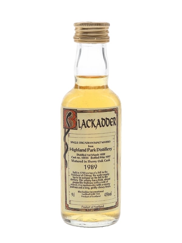 A miniature bottle of Highland Park Single Orcadian Malt Whisky. This was distilled on 1 March 1989, matured in a single sherry cask and bottled in May 1997 by Blackadder International.