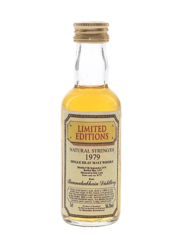 A bottle of Bunnahabhain Islay single malt Scotch whisky. This was distilled in 1979 and bottled at cask strength in May 1997 by Blackadder International.