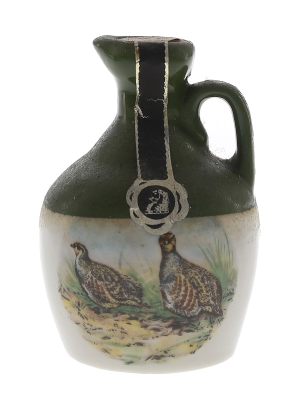A miniature ceramic decanter of Rutherford's Scotch Whisky presented in a ceramic decanter, decorated with game birds. We estimate this was bottled in the 1980s.