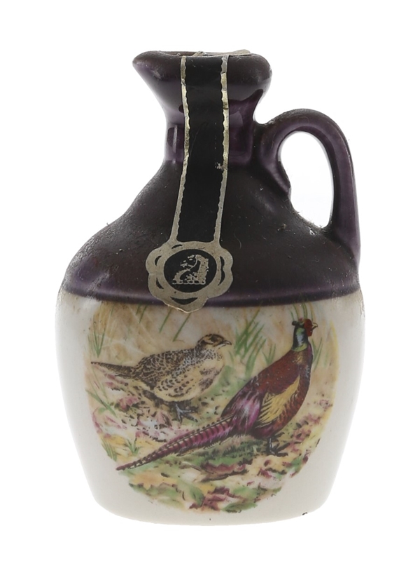 A miniature ceramic decanter of Rutherford's Scotch Whisky presented in a ceramic decanter, decorated with game birds. We estimate this was bottled in the 1980s.
