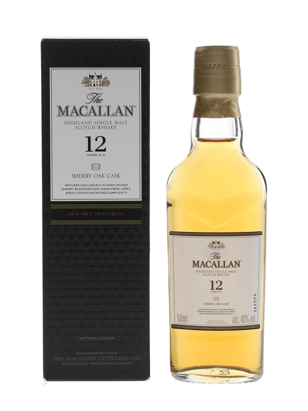 A miniature bottle of the Macallan 12 Year OId Highland Single Malt Scotch Whisky, matured in sherry seasoned oak casks from Jerez, Spain.