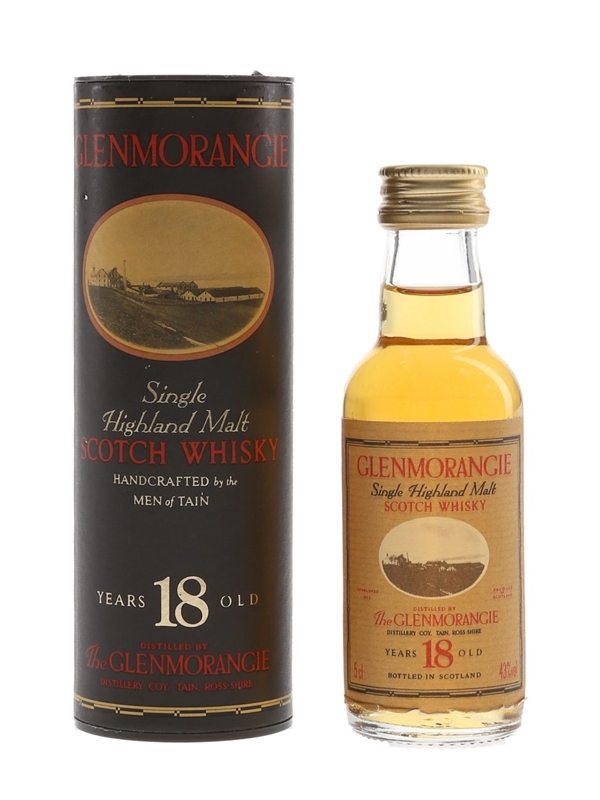 A miniature bottle of Glenmorangie 18 Year Old Single Highland Malt Scotch Whisky. We estimate this was bottled in the 1990s.