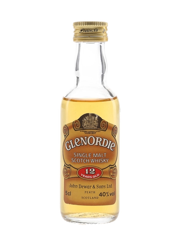 A miniature bottle of Glenordie 12 Year Old Single Malt Scotch Whisky. This was bottled by John Dewar & Sons Ltd., we estimate in the 1980s.
