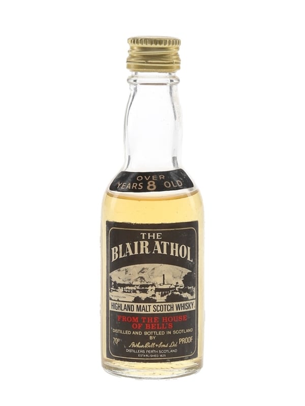 A miniature bottle of Blair Athol 8 Year Old Highland Malt Scotch Whisky, distilled and bottled by Arthur Bell & Sons. We estimate this was bottled in the 1970s.