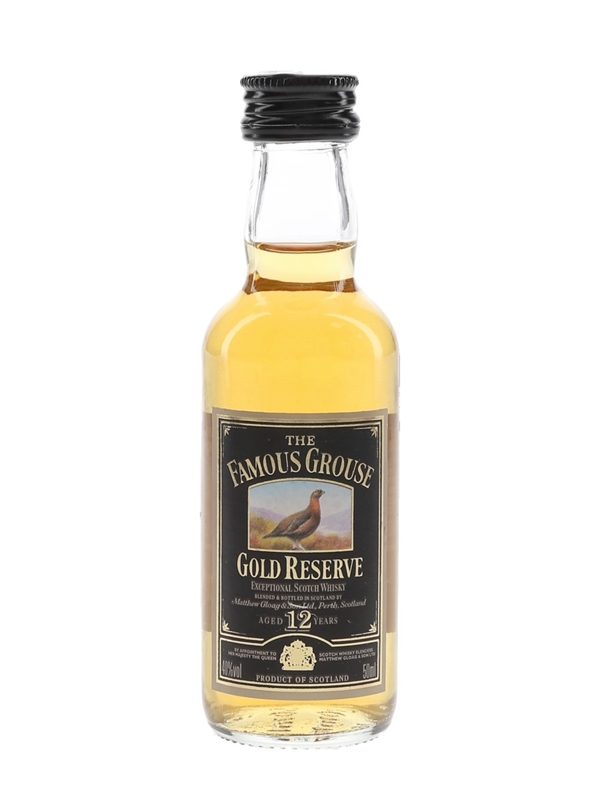 A miniature bottle of The Famous Grouse 12 Year Old Gold Reserve Exceptional Scotch Whisky, created to celebrate the centenary of the brand. This is made with a high proportion of malt whiskies, including Macallan and Highland Park.